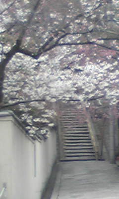 ちなみに写真の桜の後ろの石段について。先日そこの階段を下りている最中に前を歩いている一人のサラリーマンが雨の日にも関わらずリズムノリノリ下りていってたので見てたら、予想した通り勢いよく滑って転んでました。(ありゃ相当痛いだろうなぁ)で、まぁちょっと後ろ歩いてた程度なんで彼が尻餅をついている場所に限りなく近いところまで接近してたんですよ。彼が気付いてバツの悪そうな顔して私を見たんですが、私は「大丈夫ですか?」と声をかけていいものか、それとも素知らぬふりして横を通り過ぎたほうがいいのか延々悩みました。するとどうでしょう?考えてる間に彼の横を通り過ぎてしまってたんです。どうやったらあの時の彼は救われたのか、未だに私には答えが出ていません。ですのでまた次にこんな機会があったときのためにどうやってその場を乗り切るか、近いうちにナカさんと議論を交わしたいと思います(笑)
